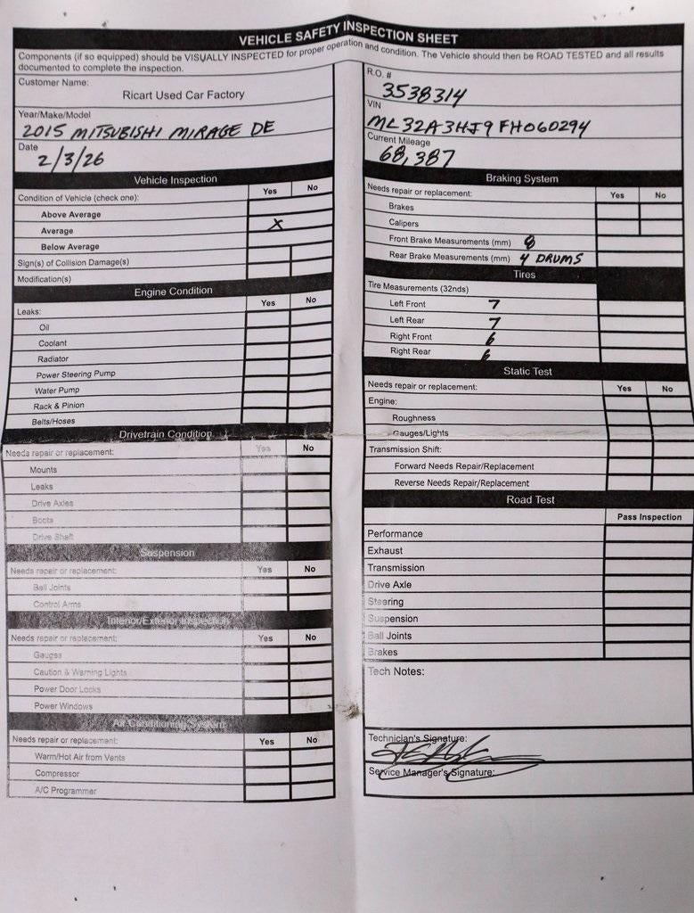 This 2015 Mitsubishi Mirage DE delivers exceptional efficiency and simple, dependable transportation in a compact hatchback design. Powered by a fuel-sipping gasoline engine paired with a smooth automatic transmission, it’s well suited for commuting and everyday errands with easy maneuverability. The interior offers a straightforward, functional layout designed to keep driving comfortable and uncomplicated. Known for its affordability and efficiency-focused engineering, this Mirage DE is available now at Ricart Automotive Used Car Factory.