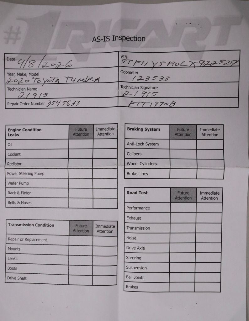 Bold, capable, and built for serious performance, this 2020 Toyota Tundra Limited CrewMax delivers rugged strength with premium comfort and advanced features. Powered by a 5.7L i-FORCE V8 engine paired with a 6-speed automatic transmission, it offers impressive towing capability and dependable performance for work or play. Inside, the cabin features leather-trimmed seating, a premium Entune system with navigation and JBL audio, dual-zone automatic climate control, and a power tilt/slide moonroof for a refined and connected driving experience. Equipped with the Limited Premium Package, TRD Off-Road Package, Predator drop steps, spray-on bedliner, and advanced safety features, this Tundra is ready for whatever the road—or trail—demands. Available now at Ricart Automotive Used Car Factory.